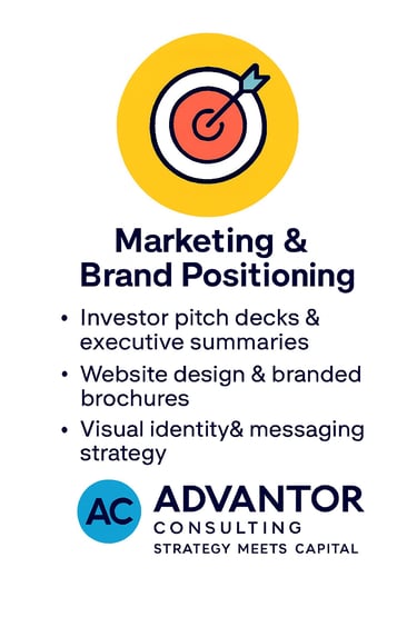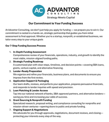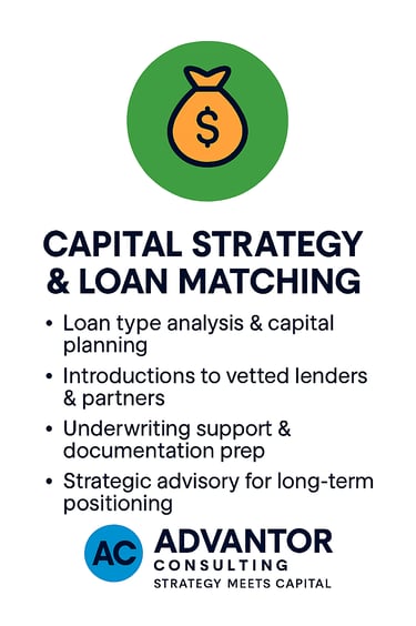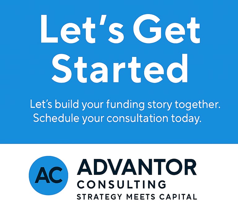 Advantor Consulting Group is a business consulting firm. We do not provide legal, tax, or investment advice, and we do not act as a lender or broker. All services are advisory in nature and intended to support clients in preparing materials and strategies for funding.