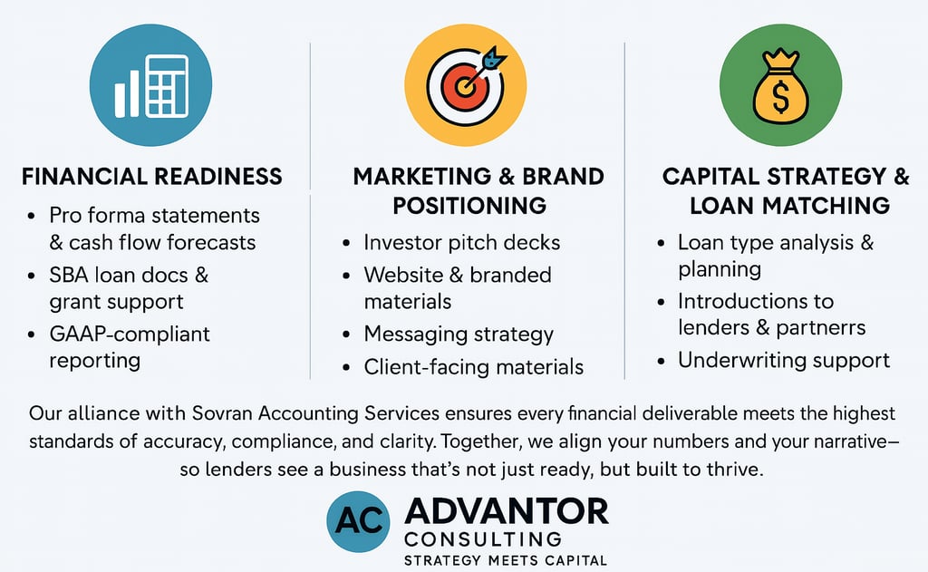 Advantor Consulting Group is a business consulting firm. We do not provide legal, tax, or investment advice, and we do not act as a lender or broker. All services are advisory in nature and intended to support clients in preparing materials and strategies for funding.