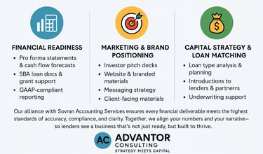 Our alliance with Sovran Accounting Services ensures every financial deliverable meets the highest standards of accuracy, compliance, and clarity. Together, we align your numbers and your narrative—so lenders see a business that’s not just ready, but built to thrive